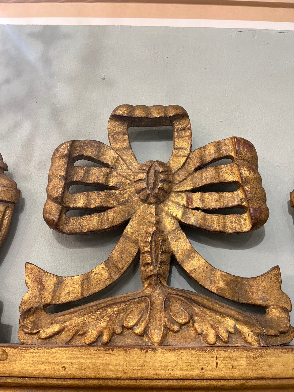 20th Century Italian Giltwood Pier Mirror in the neoclassic taste, with a scrolled lower edge, the crest with a pierced bowknot flanked by fluted urns