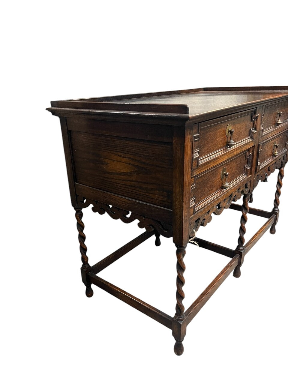 Classic Jacobean style with four geometric paneled drawers and original brass drop drawer pulls with a full-length carved apron below.